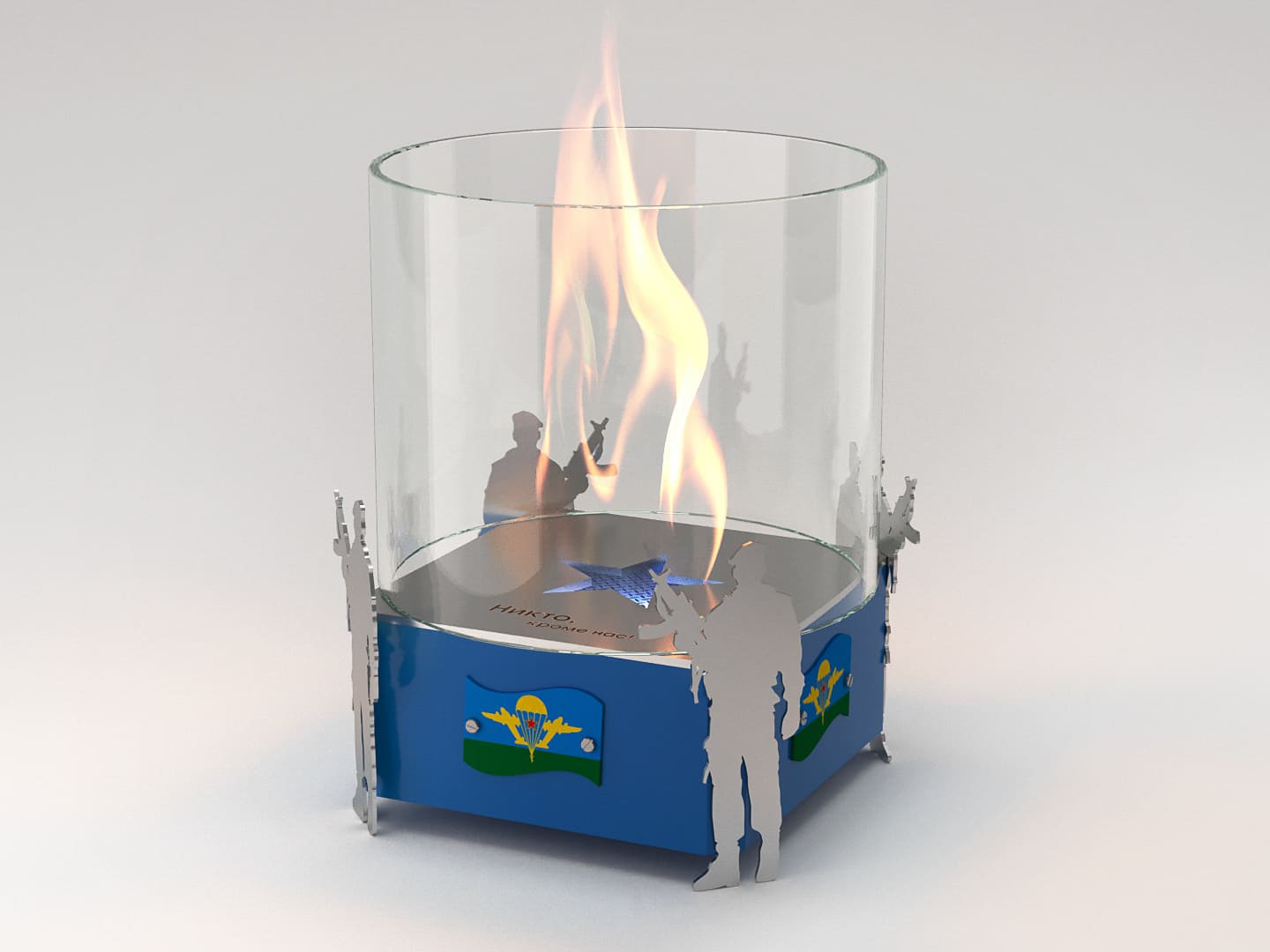 Представляет собой металлический внешний корпус с встроенным топливным блоком Lux Fire 150-2 на декоративных ножках в виде Десантников. Огонь ограничивается стеклянным закаленным плафоном диаметром 180 мм.