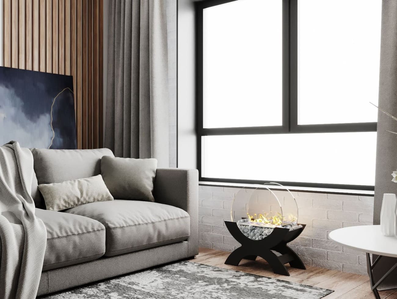Переносной камин устанавливается на полу и не требует дымохода. Линия огня данного камина 300 мм, располагается практически по всей длине камеры сгорания. Основание биокамина — 100% сталь, ножки изготовлены из МДФ, топливный блок выполнен из высококачественной нержавеющей стали, наполнитель — керамическое волокно, а также закаленные жаропрочные стекла толщиной 6 мм, камни — галтованный мрамор.